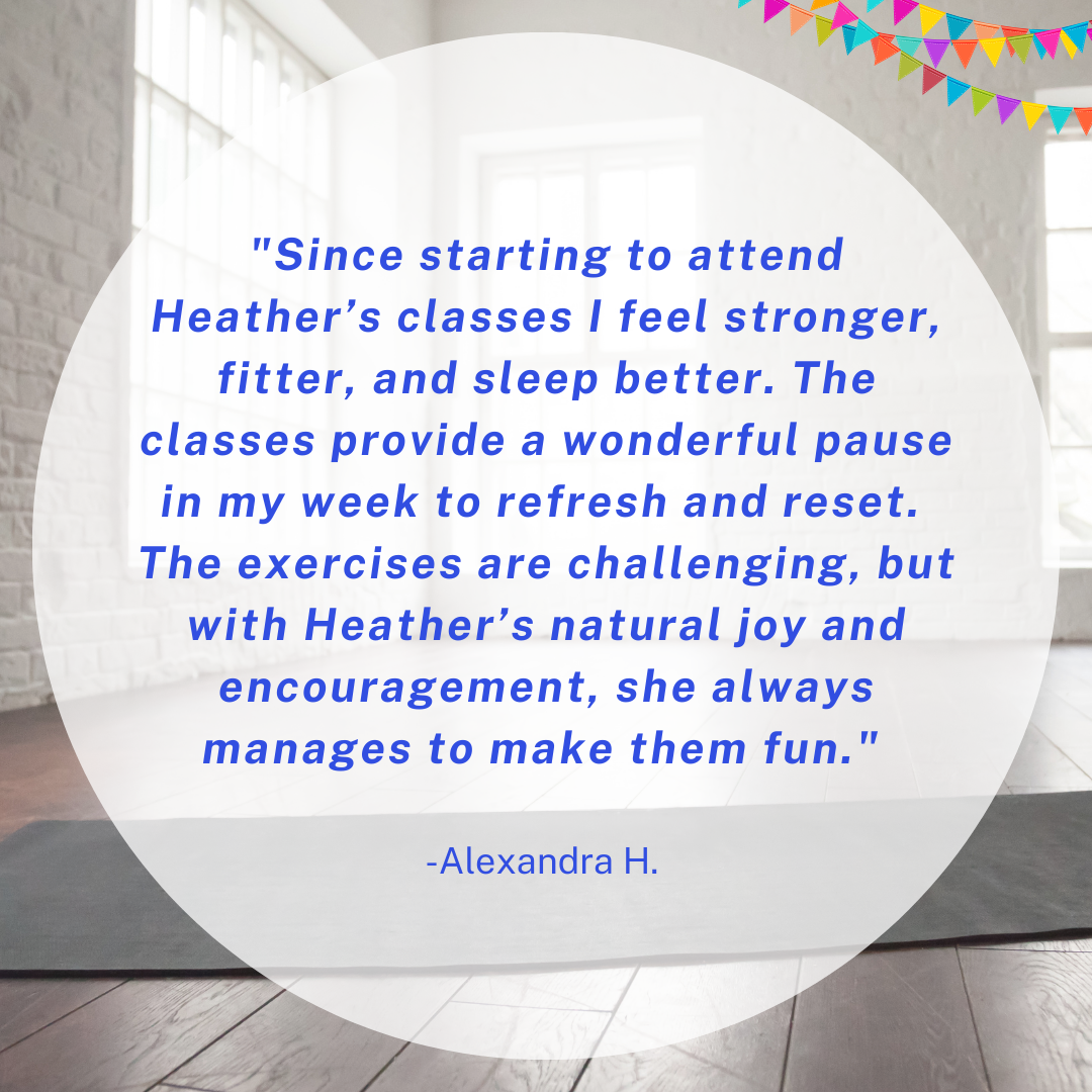 “Heather’s classes rev up my day better than another cup of coffee! Her expertise as an athletic therapist, osteopath and dancer really shine through. Her classes are fun, fresh and carefully crafted! This is what keeps me coming back!” -Cynthia K.